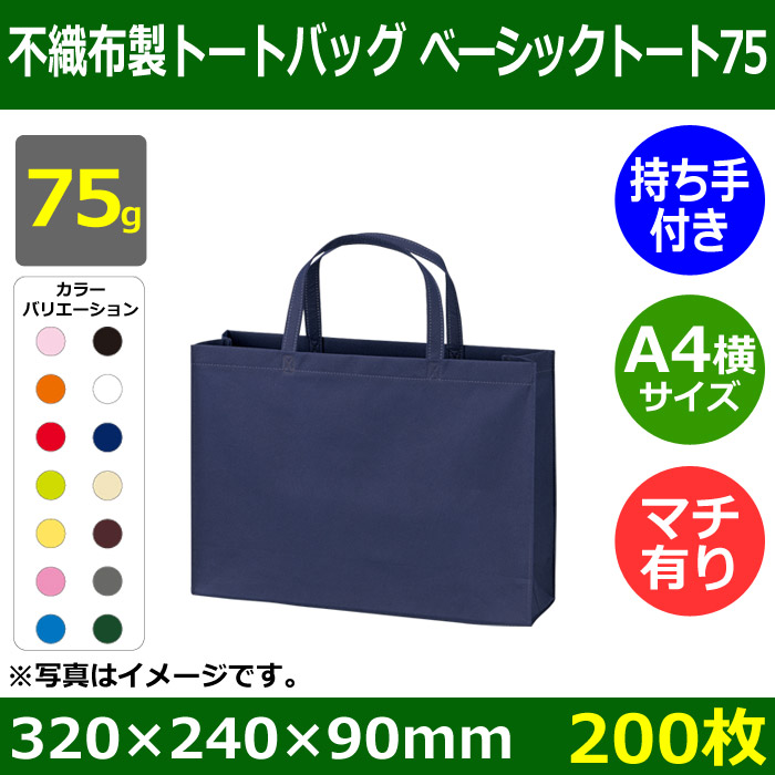 送料無料・不織布製トートバッグ(底台紙付・厚み75g)ベーシックトート75 A4横 W320×H240×G90mm「200枚・1000枚・2000枚」全14色
