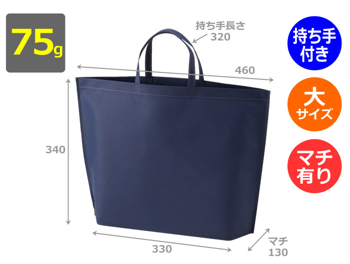 75gの厚手生地を使用した、底マチ仕様の不織布バッグ。