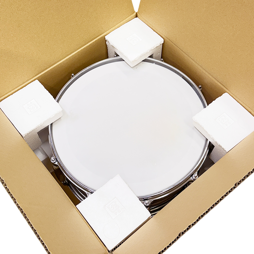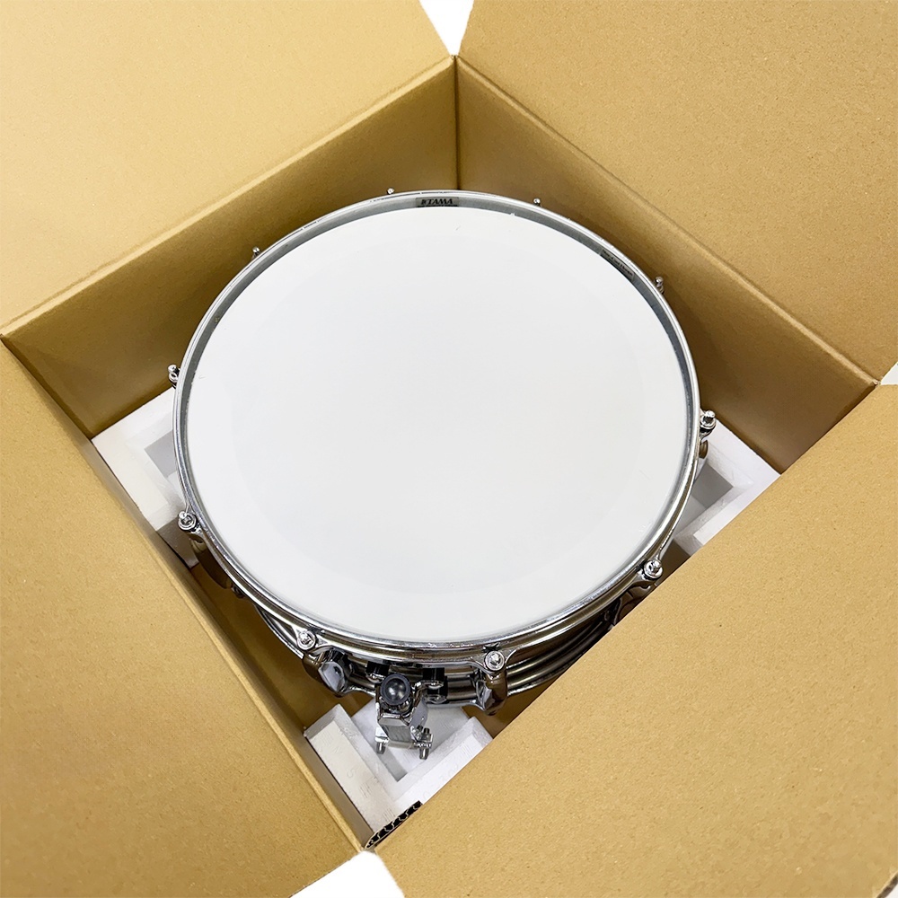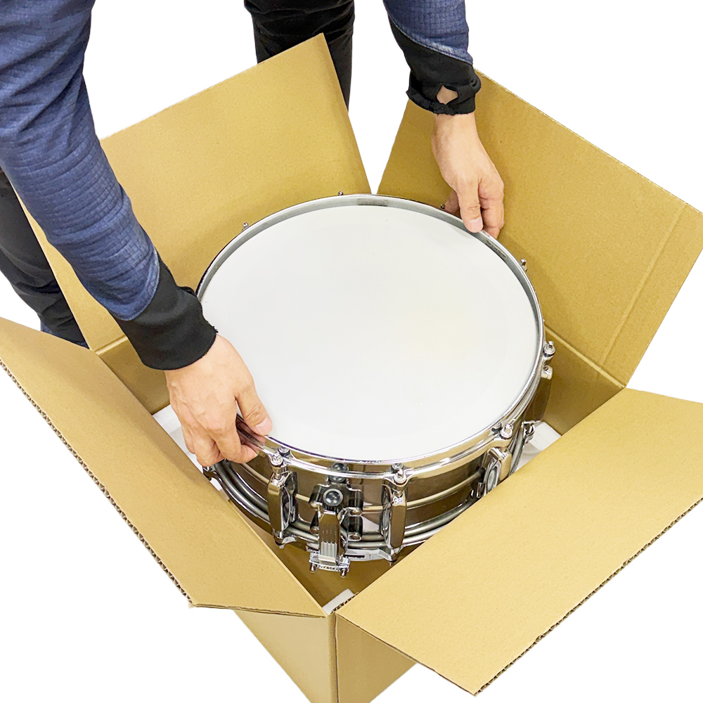 ダンボール箱とスチロールコーナーを採用し、スネアを四方からしっかりホールド。