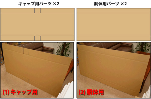 | (1)キャップ用ダンボール板 (1セットにつき2枚使用) (2)胴体用ダンボール板 (1セットにつき2枚使用) |