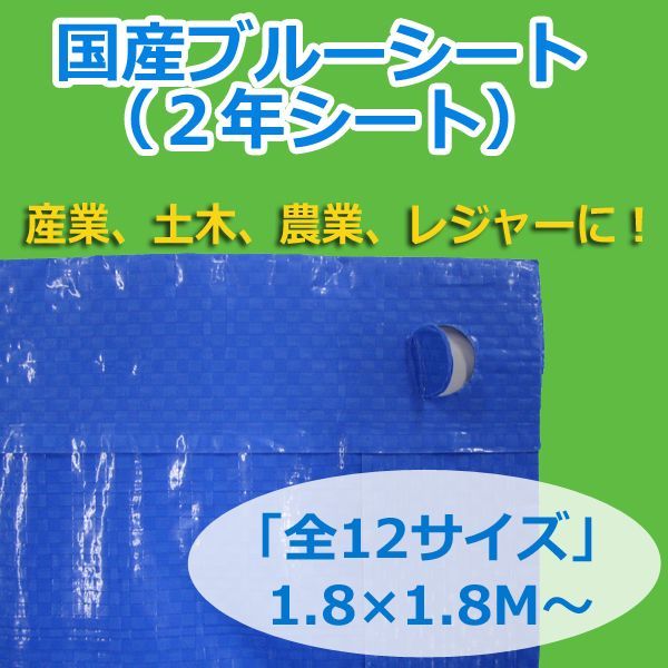 送料無料・「国産」ブルーシート(2年シート) 1.8×1.8Mから「全12サイズ」 [4020-2y-1]
